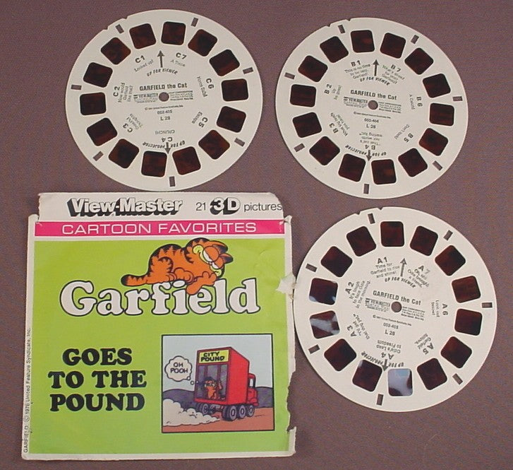 View-Master Set Of 3 Reels, Garfield Goes To The Pound, Cartoon Favorites, L 28, L28, 002-403 002-404 002-405, The Packet Is Torn, 1978