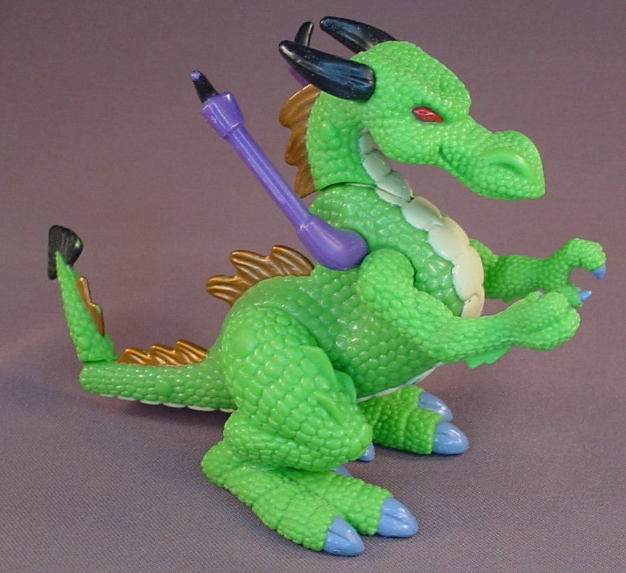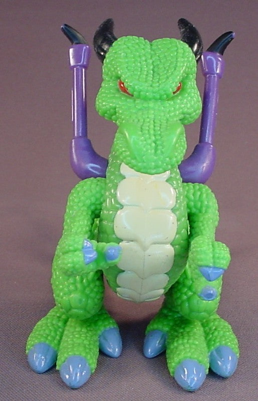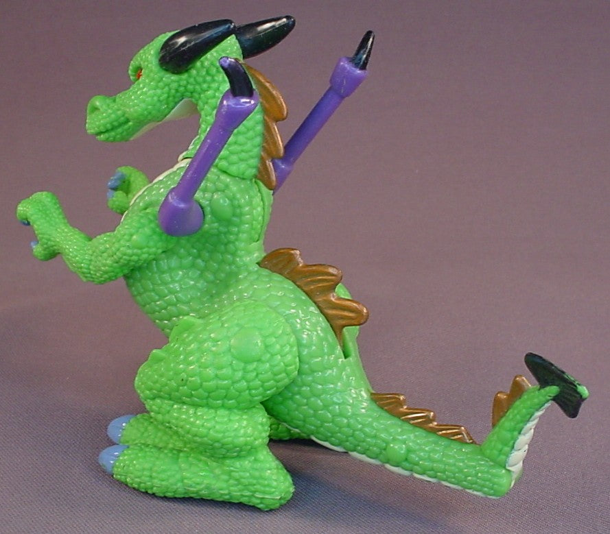Green Scaled Dragon Figure With Gold Spikes And Black Horns, 5 Inches Tall, The Legs Arms & The Tip Of The Tail All Move, Press The Gold Spikes On The Back To Move The Head And Purple Arms, Unknown Manufacturer Or Series, Great Figure To Add To Any Medieval Castle Or Fantasy Playset