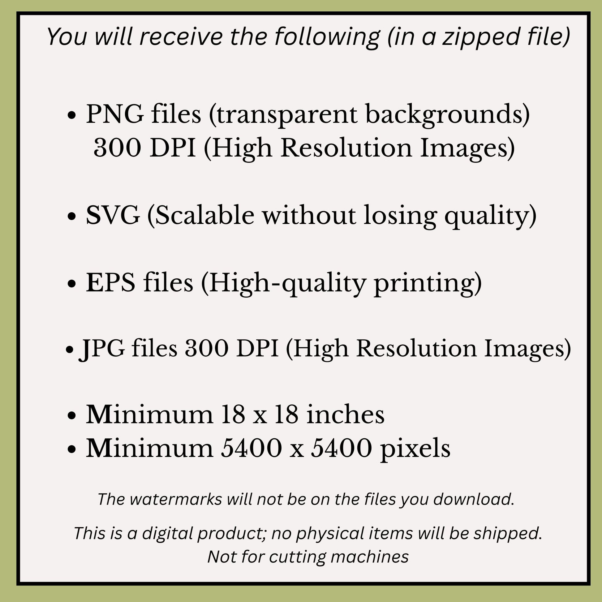 The image shown in the picture has watermarks. You will receive the high resolution files without watermarks.