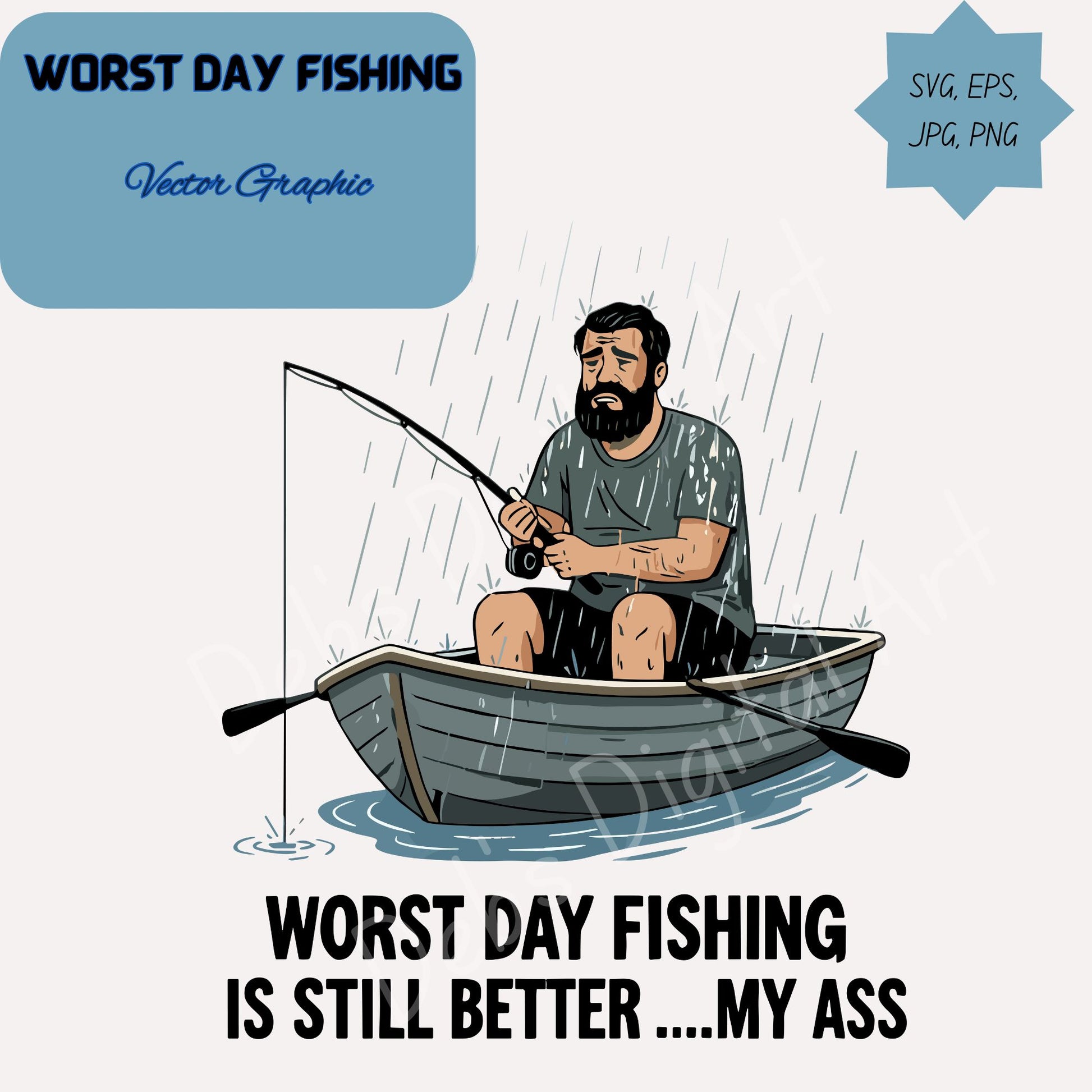 Add humor to your fishing-themed designs with this funny clipart of a man sitting in a small rowboat fishing in the pouring rain. The artwork features the bold text: “WORST DAY FISHING…MY ASS”, making it perfect for anglers who love a good laugh.