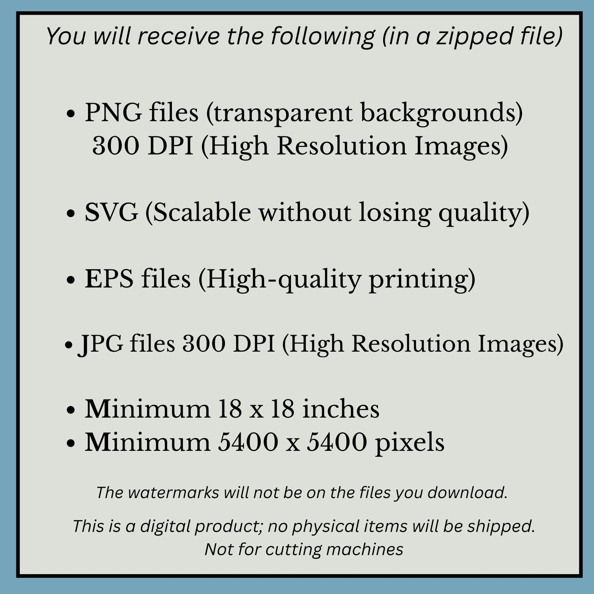 This digital illustration comes in SVG, PNG, EPS, and JPG formats. The PNG and JPG files include transparent backgrounds at 300 DPI, giving you crisp, professional-quality results. (Not for cutting machines.)