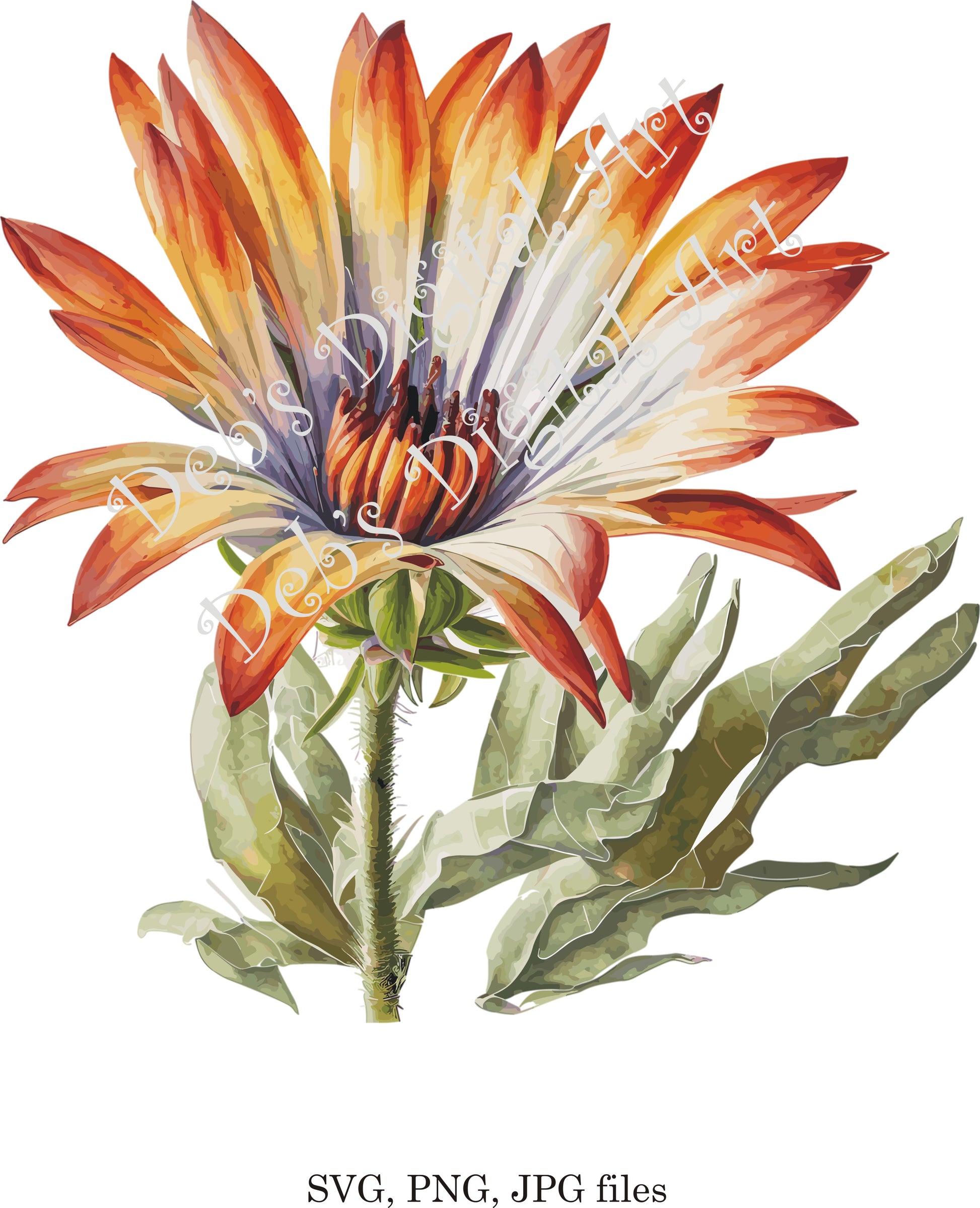 Watercolor botanical Gazania grey orange flower plant digital clipart, vector, png. jpg, jpeg, svg wall art, graphic